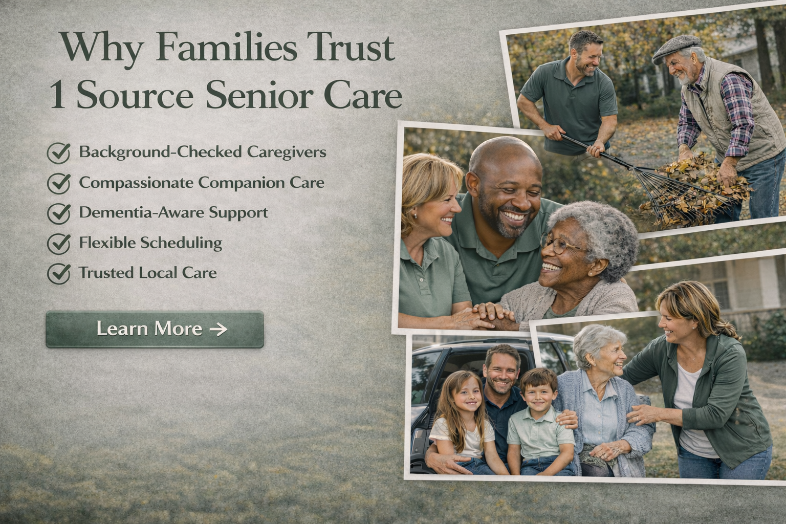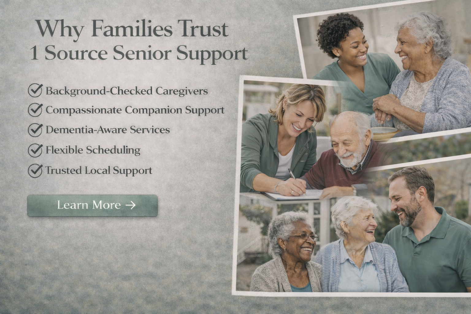 1 Source Senior Support provides non-medical companion and supervision services only. Our caregivers do not provide medical care, skilled nursing services, or hands-on personal care assistance. Clients requiring medical care should consult with a licensed healthcare provider or home health agency.