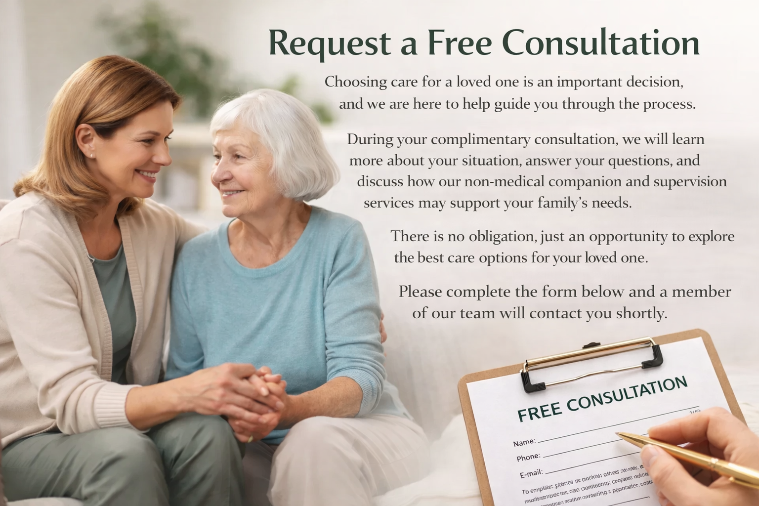 No pressure. No obligation. Just a caring conversation to help guide your next steps. We’re here to help you find the right support for your loved one.